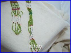 For offer is a hand beaded piece that measures 60" plus 4" of looped fringe on one end, 8 on the other. It is made with primarily clear green beads, 21 beads in each row making it 1 1/16 wide. There is a plant motif as well as other geometric designs with red, blue, and white. It is in fair condition, there are a couple of areas that are missing beads, some of the fringe is missing.