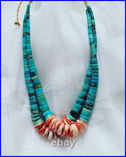 Royston turquoise graduated with spiny oyster shell strung on wax thread braided at the ended. U can wear it as a choker or hang it at the end of a long necklace of course. Very pretty made by me.